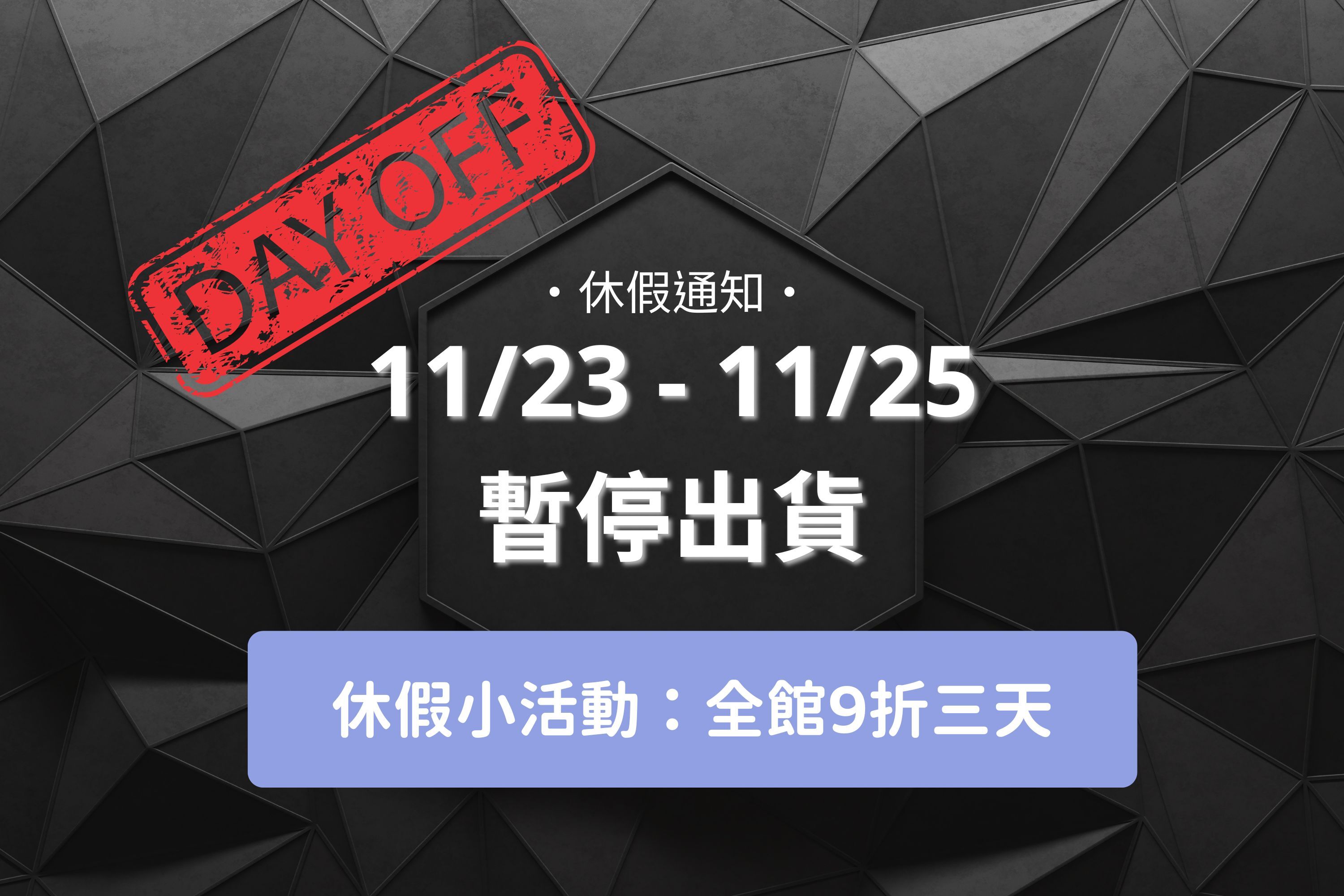 11/23 – 11/25 三天期間,全館不限金額直接 9 折,等我們回來後立刻幫您寄出帥氣配件。